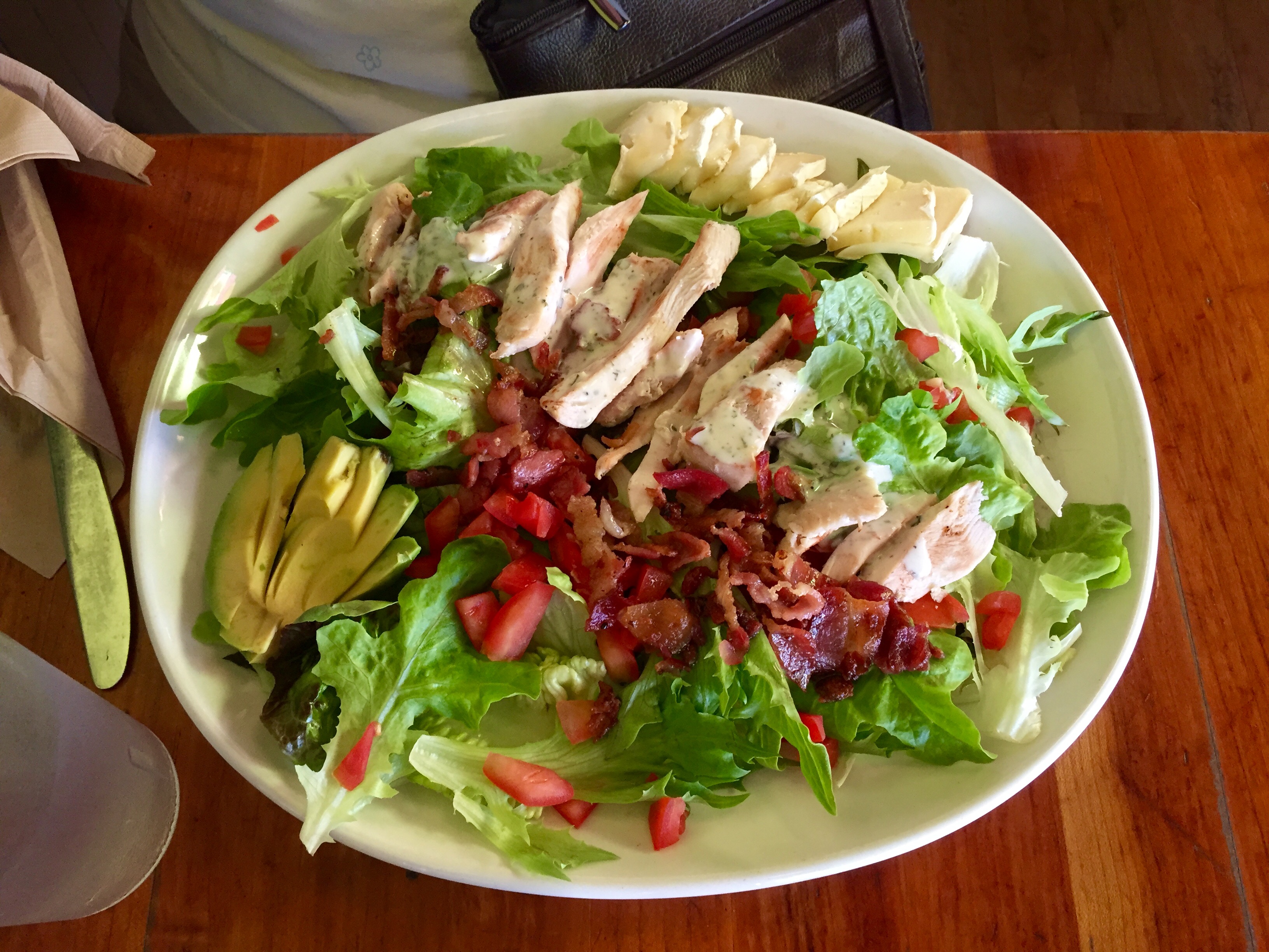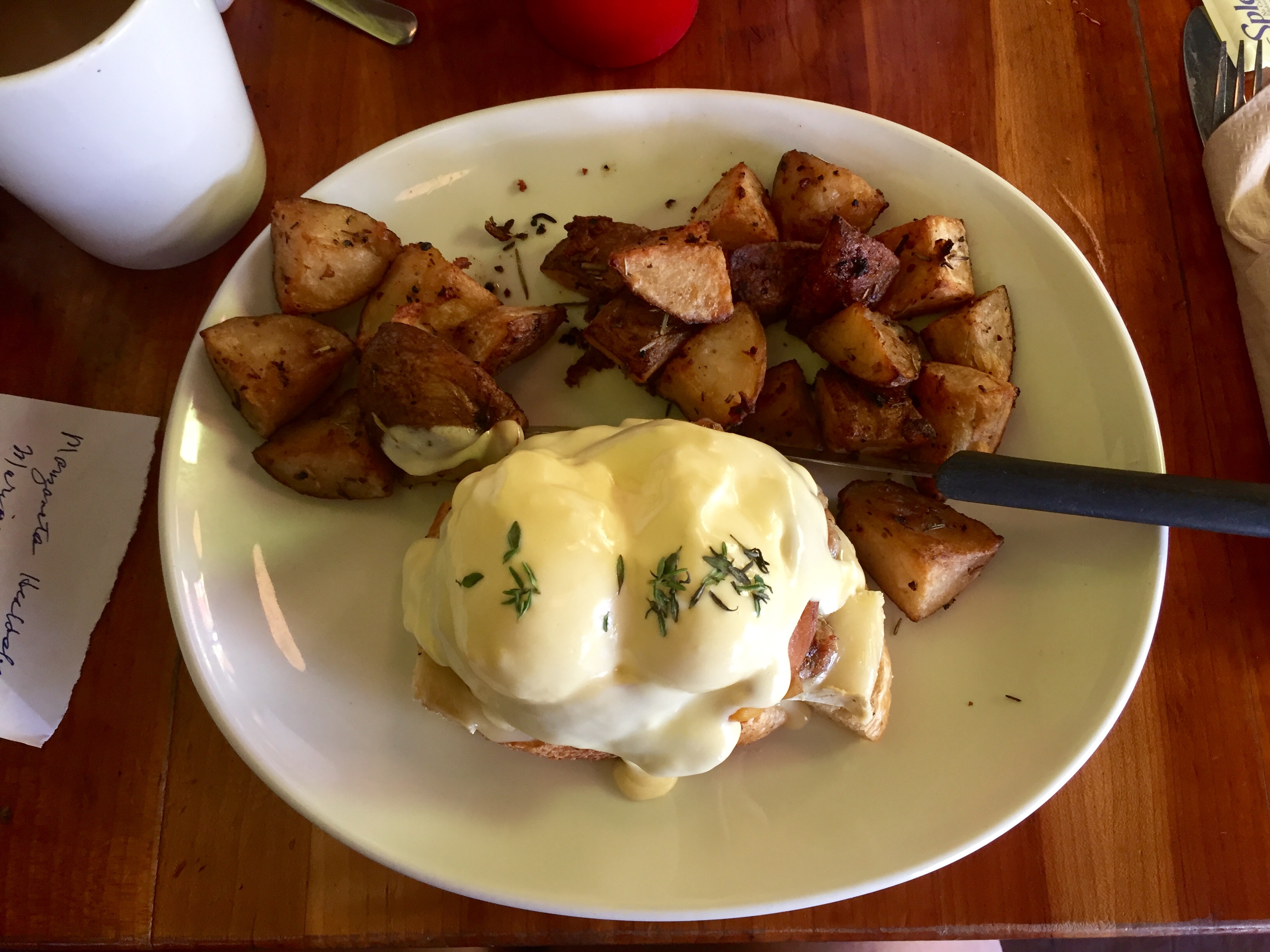 I had the Peachy Pork Benny which is August’s Benny special. It was a housemade pork sausage patty, roasted peaches, and brie cheese on roasted garlic cracked black pepper artisan bread topped with two poached eggs and fresh thyme hollandaise. Mum had the Cascadian Cobb Salad. Both of enjoyed our meals immensely. This is my third visit to Shine as I am in Victoria quite often, but this was the first time for Mum.